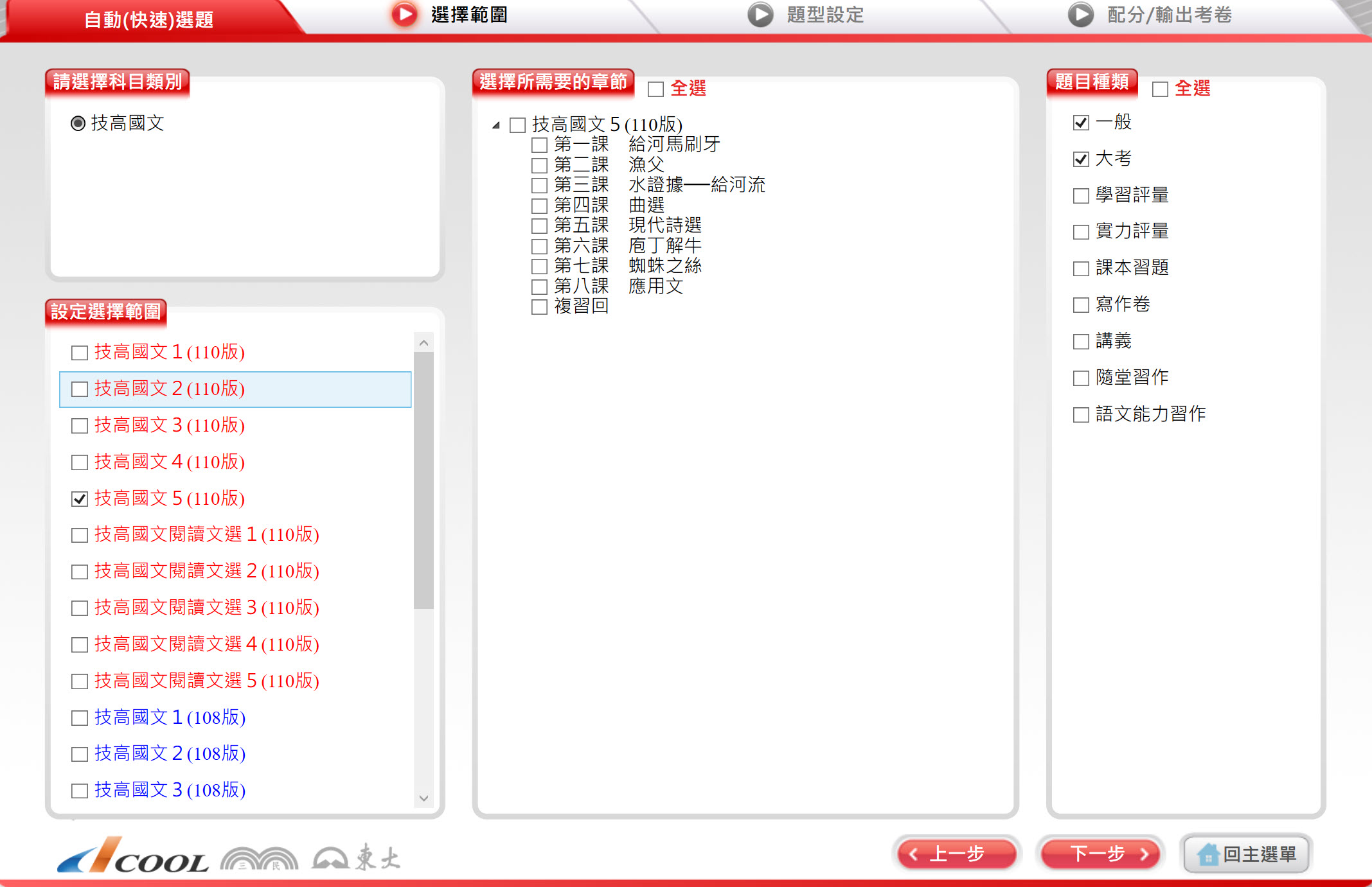 112學年上學期 技術高中命題光碟 三民東大版 國文科(一、二、三、四、五、六、閱讀文選)(108課綱) 題庫光碟